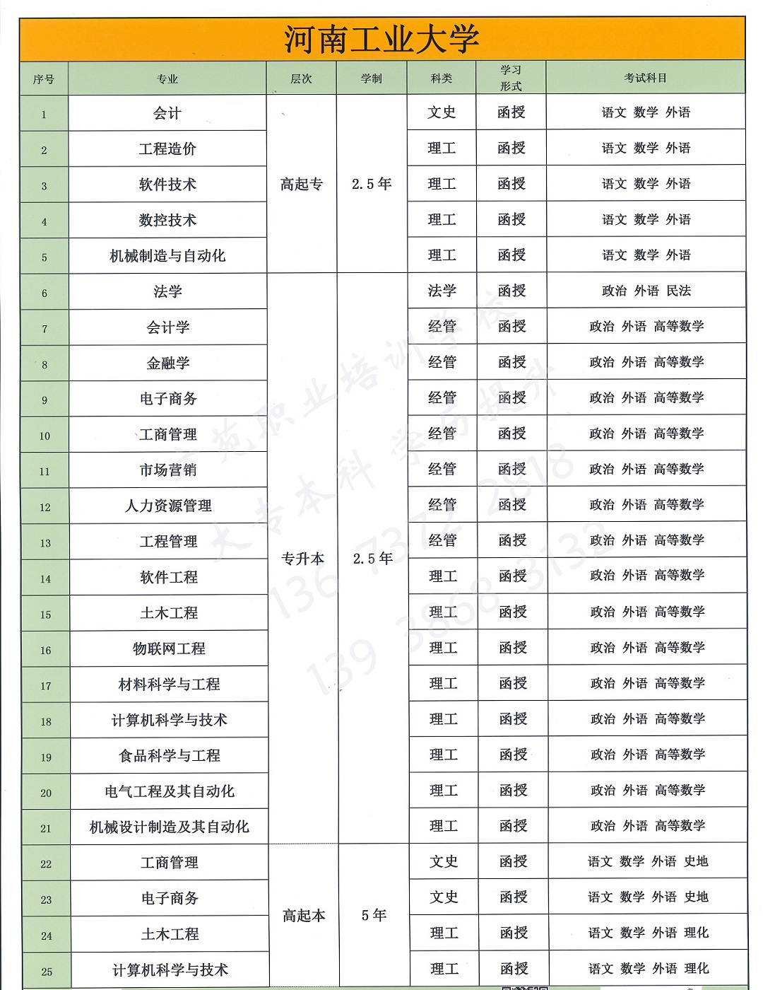 专业涵盖:建筑工程技术,土木工程,计算机网络技术,计算机科学与技术,电气工程及其自动化,车辆工程,工程造价,小学教育,汉语言文学,旅游管理,市场营销,会计,法学,工商管理,电子商务,人力资源管理、行政管理、护理学、药学、医学影像技术、医学检验技术、英语、历史学、美术学、音乐学、心里学、经济学、汽车检测与维修技术、安全工程、环境工程、眼视光学、口腔医学技术、药品生产技术、房地产经营与管理、道路与桥梁工程技术等。