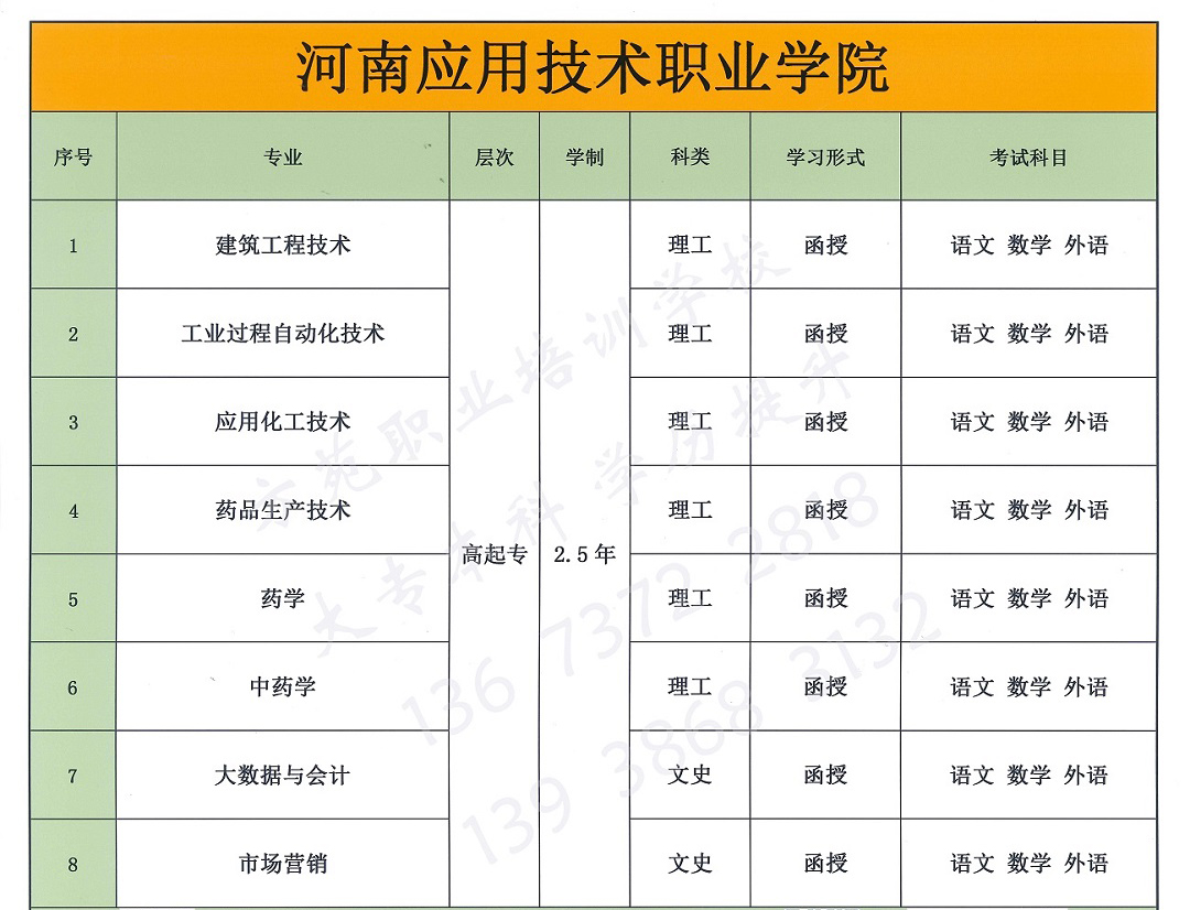 专业涵盖:建筑工程技术,土木工程,计算机网络技术,计算机科学与技术,电气工程及其自动化,车辆工程,工程造价,小学教育,汉语言文学,旅游管理,市场营销,会计,法学,工商管理,电子商务,人力资源管理、行政管理、护理学、药学、医学影像技术、医学检验技术、英语、历史学、美术学、音乐学、心里学、经济学、汽车检测与维修技术、安全工程、环境工程、眼视光学、口腔医学技术、药品生产技术、房地产经营与管理、道路与桥梁工程技术等。