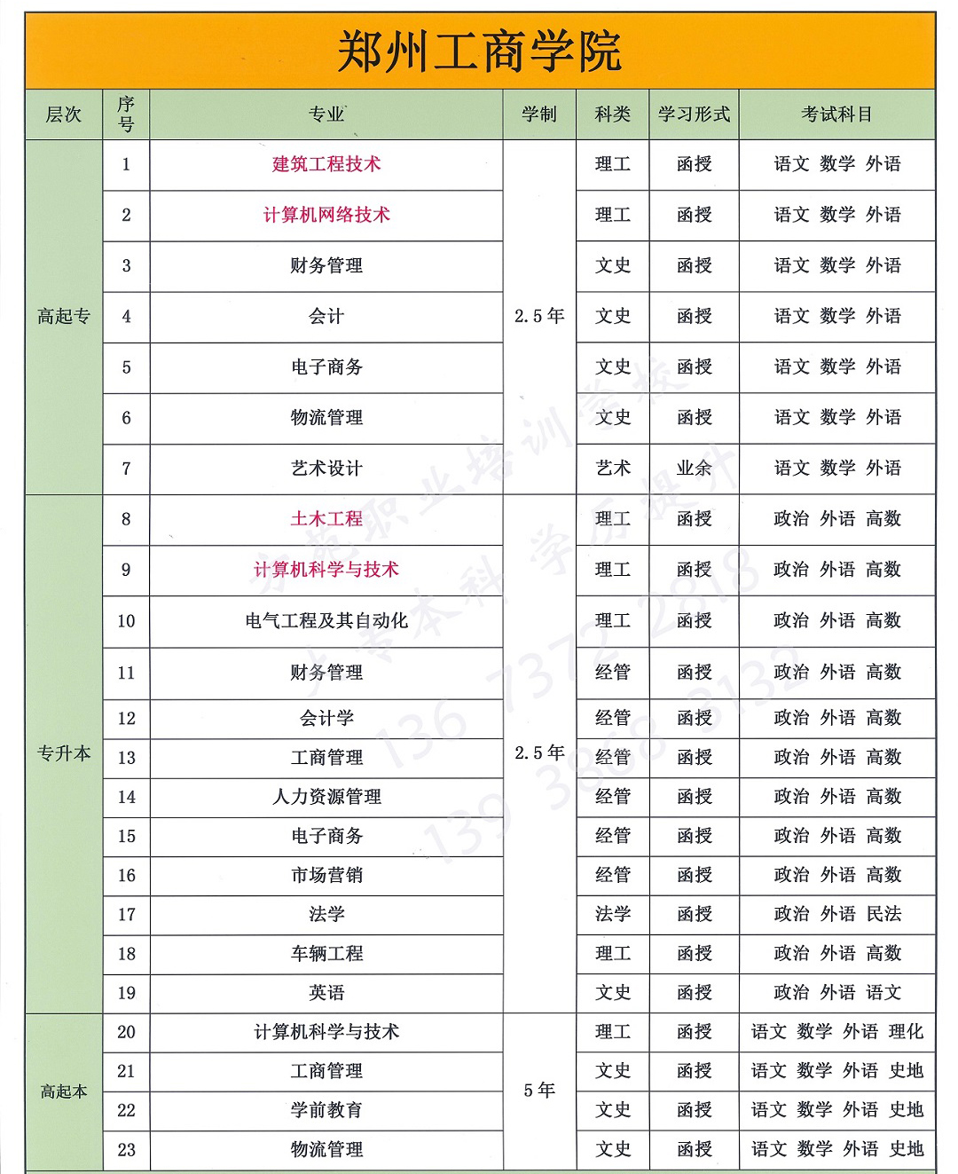 专业涵盖:建筑工程技术,土木工程,计算机网络技术,计算机科学与技术,电气工程及其自动化,车辆工程,工程造价,小学教育,汉语言文学,旅游管理,市场营销,会计,法学,工商管理,电子商务,人力资源管理、行政管理、护理学、药学、医学影像技术、医学检验技术、英语、历史学、美术学、音乐学、心里学、经济学、汽车检测与维修技术、安全工程、环境工程、眼视光学、口腔医学技术、药品生产技术、房地产经营与管理、道路与桥梁工程技术等。