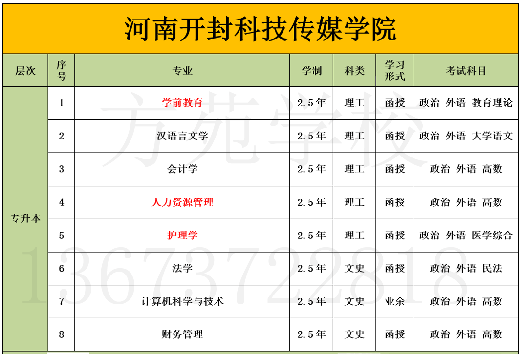 专业涵盖:建筑工程技术,土木工程,计算机网络技术,计算机科学与技术,电气工程及其自动化,车辆工程,工程造价,小学教育,汉语言文学,旅游管理,市场营销,会计,法学,工商管理,电子商务,人力资源管理、行政管理、护理学、药学、医学影像技术、医学检验技术、英语、历史学、美术学、音乐学、心里学、经济学、汽车检测与维修技术、安全工程、环境工程、眼视光学、口腔医学技术、药品生产技术、房地产经营与管理、道路与桥梁工程技术等。