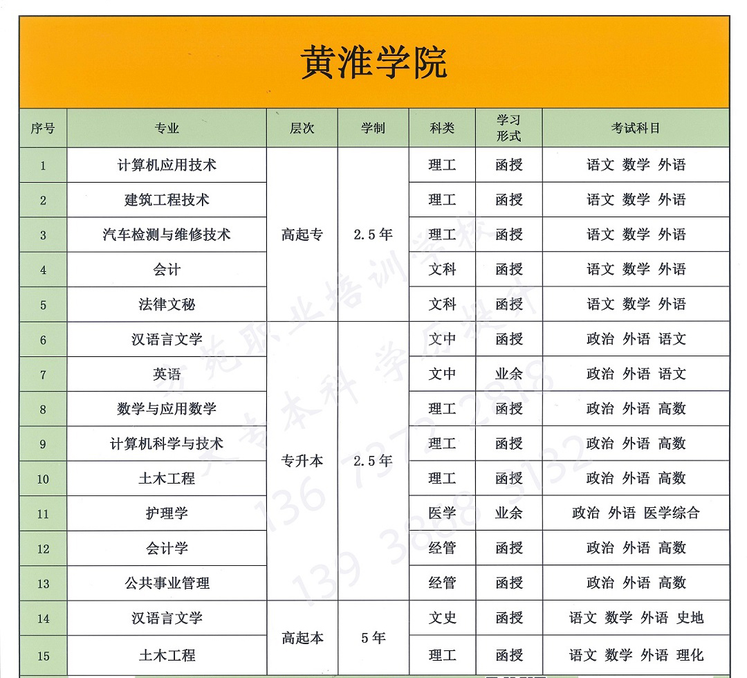 专业涵盖:建筑工程技术,土木工程,计算机网络技术,计算机科学与技术,电气工程及其自动化,车辆工程,工程造价,小学教育,汉语言文学,旅游管理,市场营销,会计,法学,工商管理,电子商务,人力资源管理、行政管理、护理学、药学、医学影像技术、医学检验技术、英语、历史学、美术学、音乐学、心里学、经济学、汽车检测与维修技术、安全工程、环境工程、眼视光学、口腔医学技术、药品生产技术、房地产经营与管理、道路与桥梁工程技术等。
