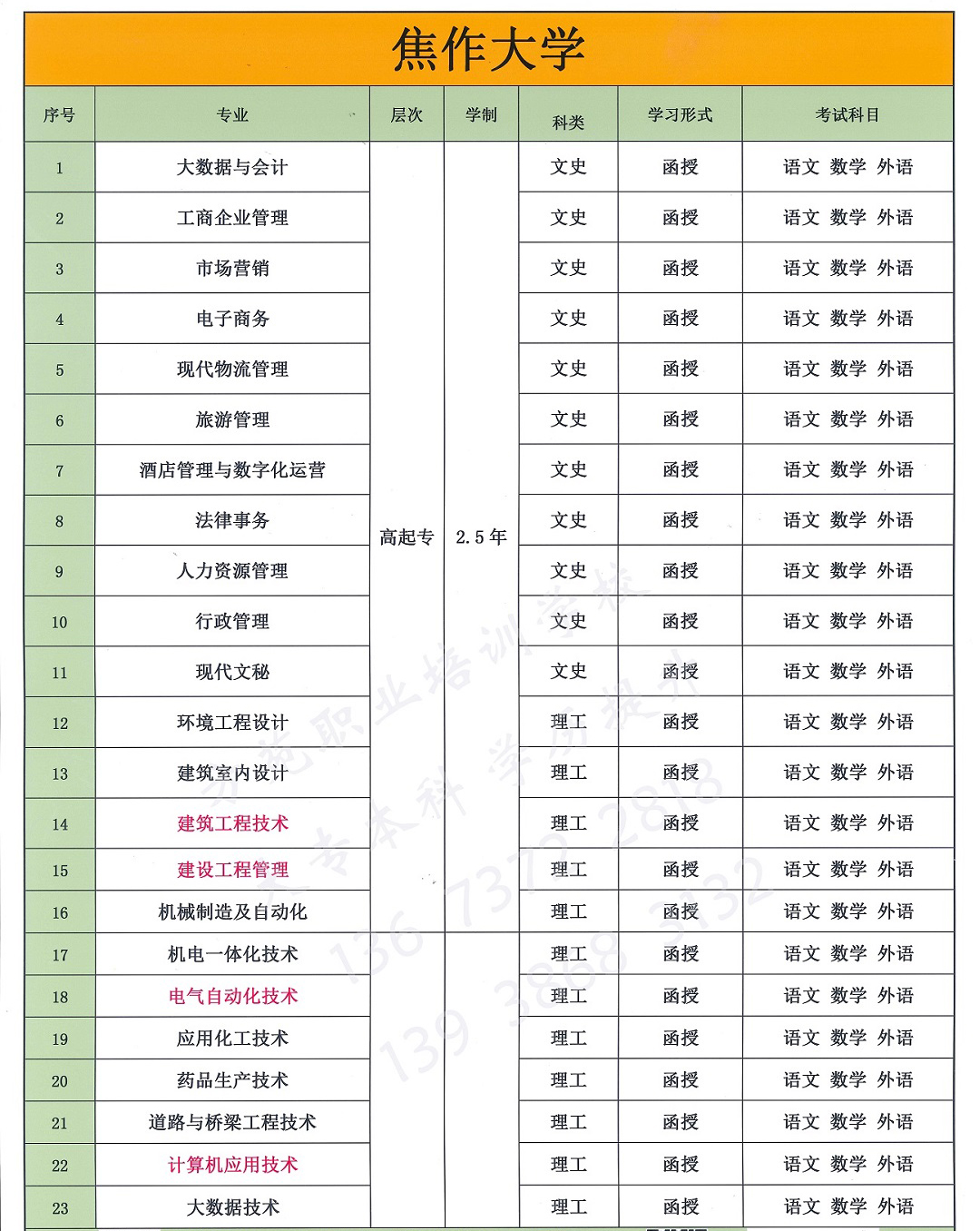 专业涵盖:建筑工程技术,土木工程,计算机网络技术,计算机科学与技术,电气工程及其自动化,车辆工程,工程造价,小学教育,汉语言文学,旅游管理,市场营销,会计,法学,工商管理,电子商务,人力资源管理、行政管理、护理学、药学、医学影像技术、医学检验技术、英语、历史学、美术学、音乐学、心里学、经济学、汽车检测与维修技术、安全工程、环境工程、眼视光学、口腔医学技术、药品生产技术、房地产经营与管理、道路与桥梁工程技术等。