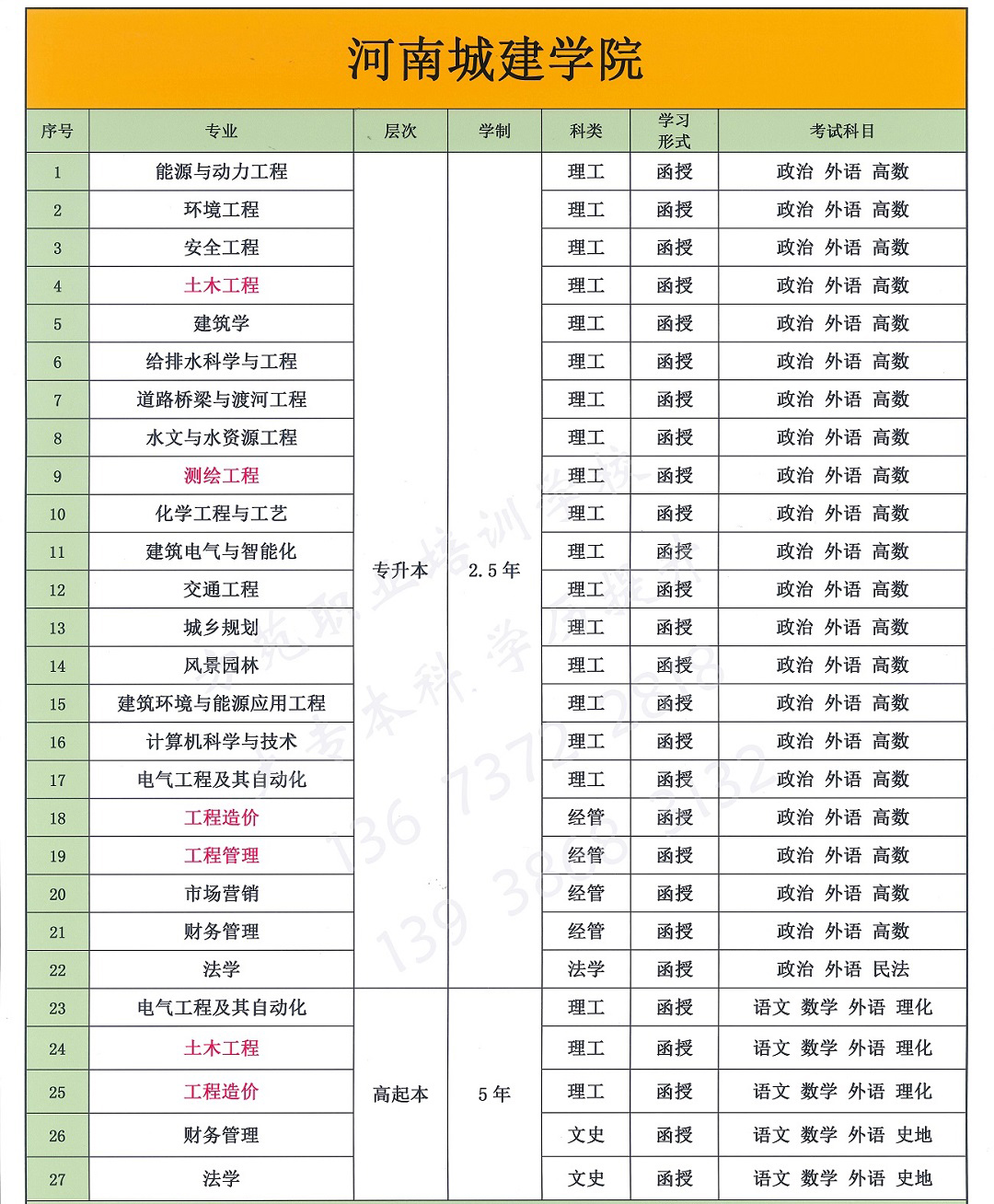 专业涵盖:建筑工程技术,土木工程,计算机网络技术,计算机科学与技术,电气工程及其自动化,车辆工程,工程造价,小学教育,汉语言文学,旅游管理,市场营销,会计,法学,工商管理,电子商务,人力资源管理、行政管理、护理学、药学、医学影像技术、医学检验技术、英语、历史学、美术学、音乐学、心里学、经济学、汽车检测与维修技术、安全工程、环境工程、眼视光学、口腔医学技术、药品生产技术、房地产经营与管理、道路与桥梁工程技术等。